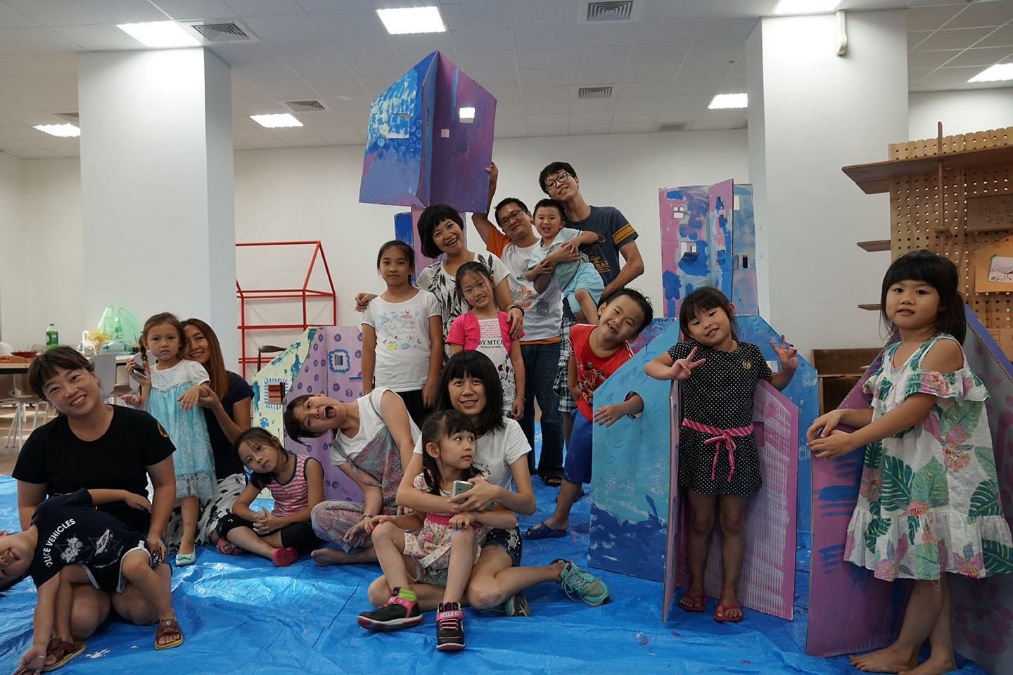 社宅的孩子非常多,因此透過「種子藝術家」計畫,與長期投入兒童藝術體驗的《停停群島工作室》合開四場系列工作坊,包含塗鴉、手作、互動等內容,而且都與家的想像有關,孩子、家長和藝術家們都開心地玩成一片,拉近彼此距離。